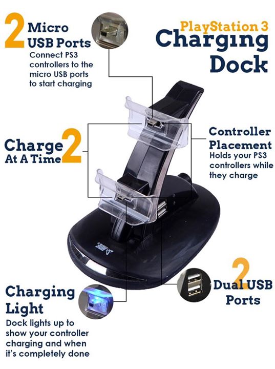 Dual USB Charging Charger Dock Station Stand for PS3 Sony Playstation 3 PS 3 Wireless Remote Controller LED light Docking Power Stand Cradle (with extra 2 USB Ports)