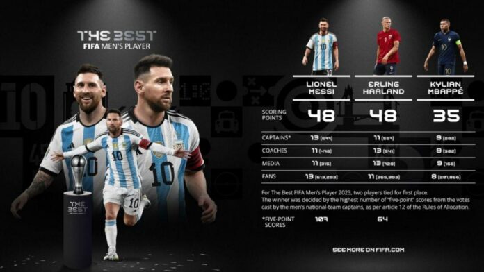Messi superou o norueguês Erling Haaland (Manchester City) e o francês Kylian Mbappé, do Paris Saint-Germain.