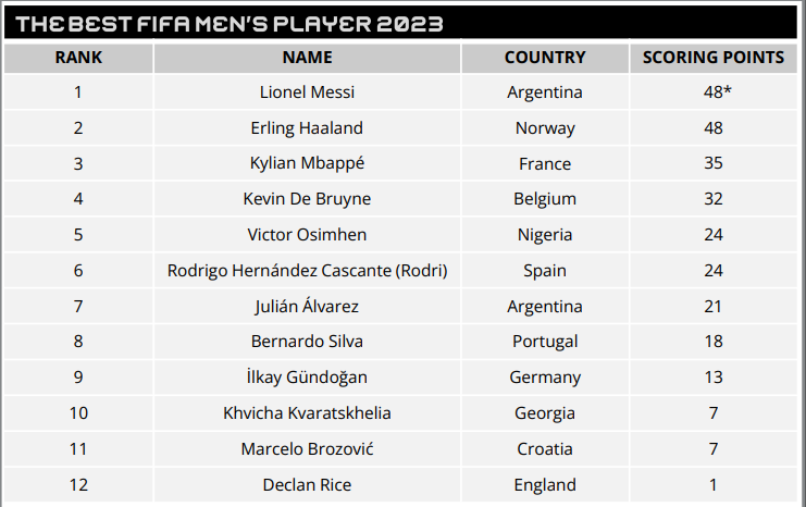 O jogador do Inter Miami, que não estava na gala, é eleito pelo segundo consecutivo e pela oitava (!) vez na carreira, se tivermos em conta o prémio de 2009 (ainda com outra designação) e os que foram atribuídos pela FIFA em parceria com a France Football, de 2010 a 2015.